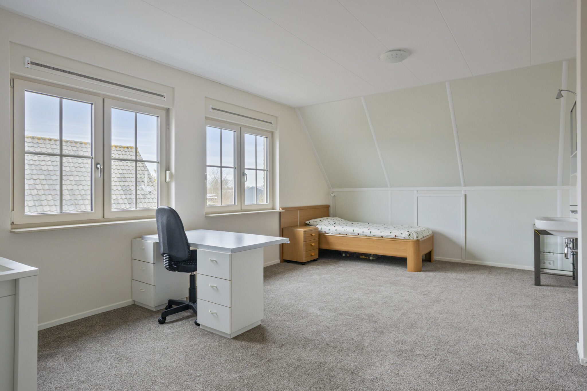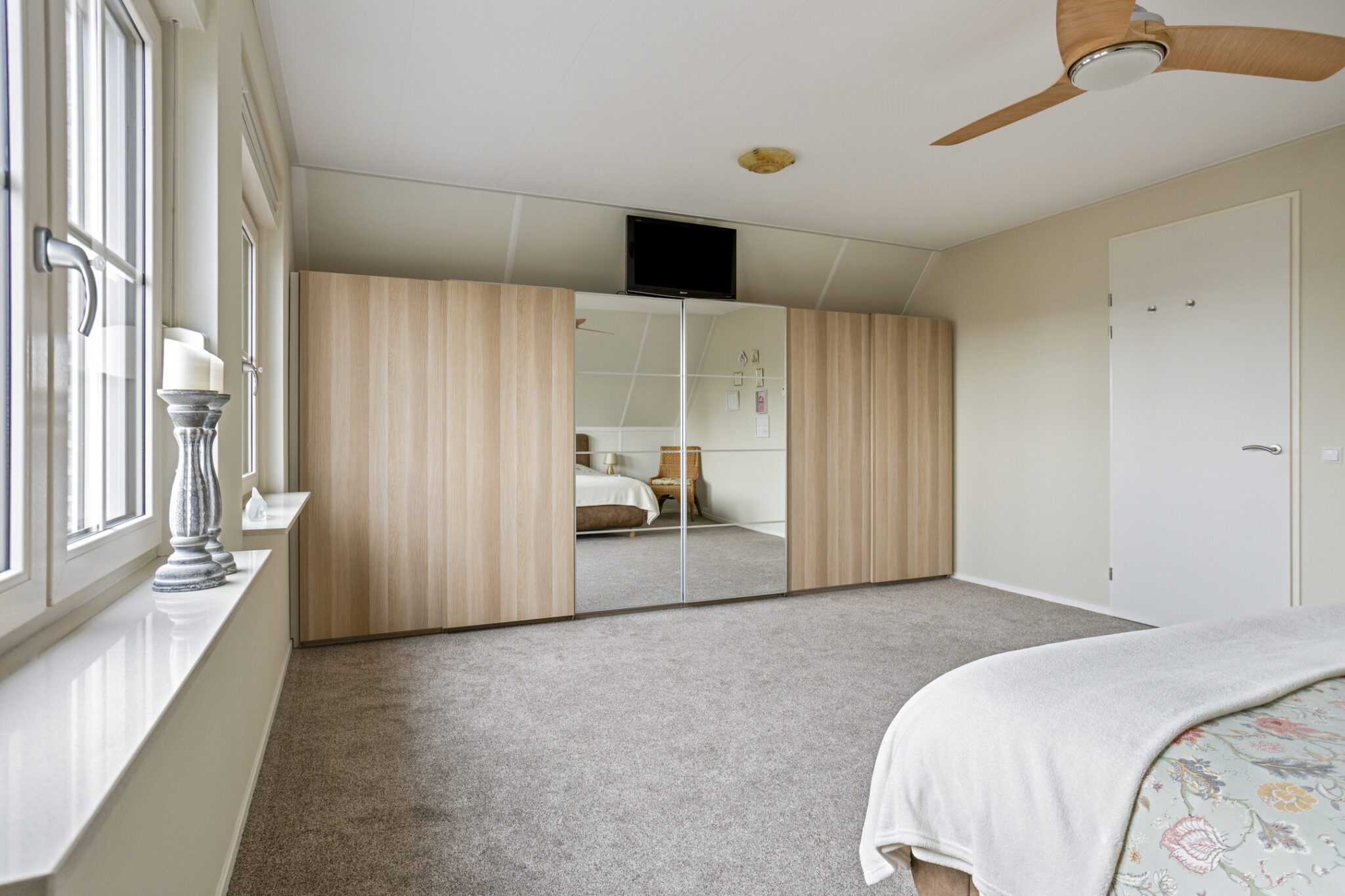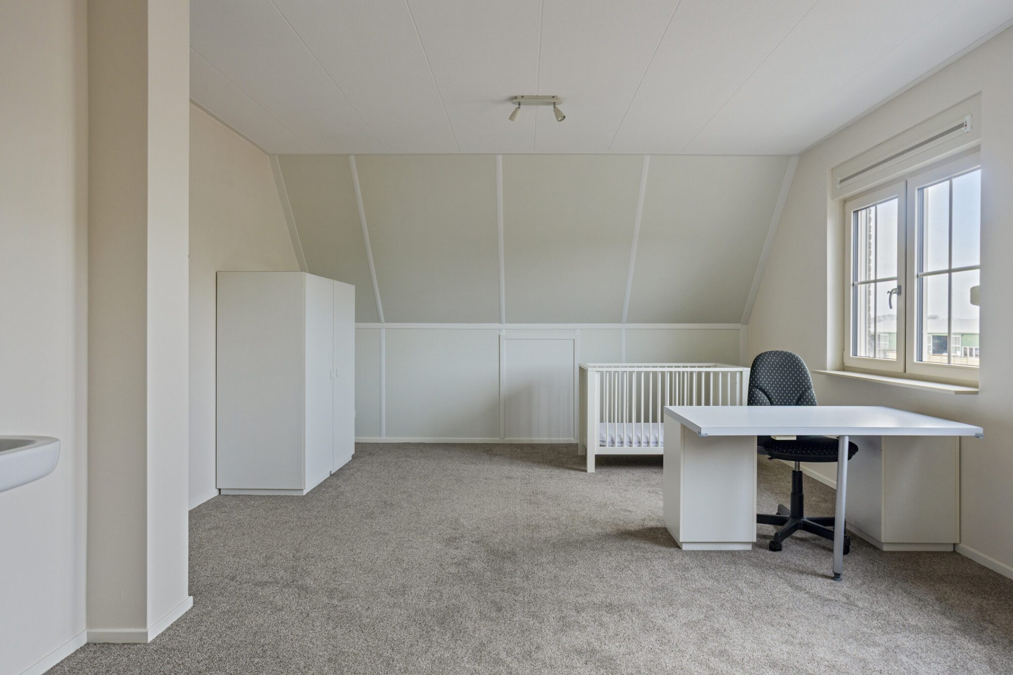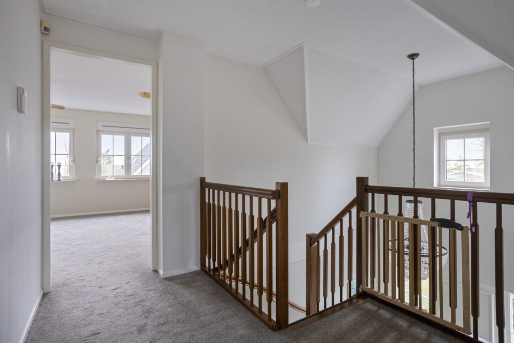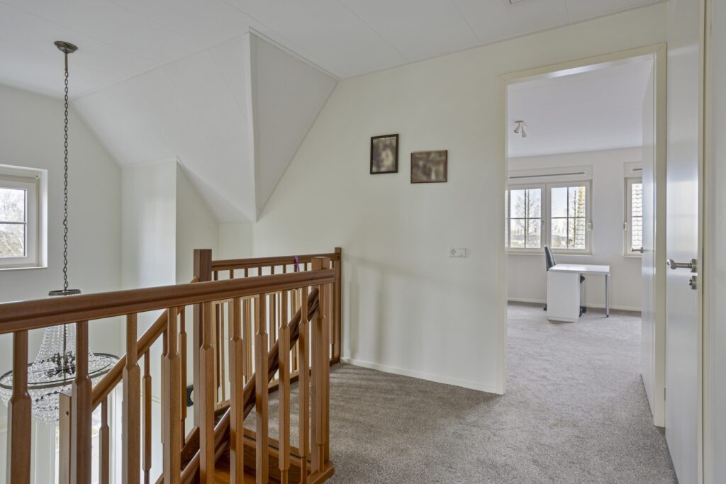 Via de vaste houten trap bereikt u de overloop met vide. Op de eerste verdieping zijn twee ruime slaapkamers, waarvan één voorzien van vaste wastafel. De slaapkamers zijn eenvoudig met een tussenwand op te splitsen in meerdere kamers. De badkamer is voorzien van een douche met stoomcabine, wastafelmeubel en hangend closet.
