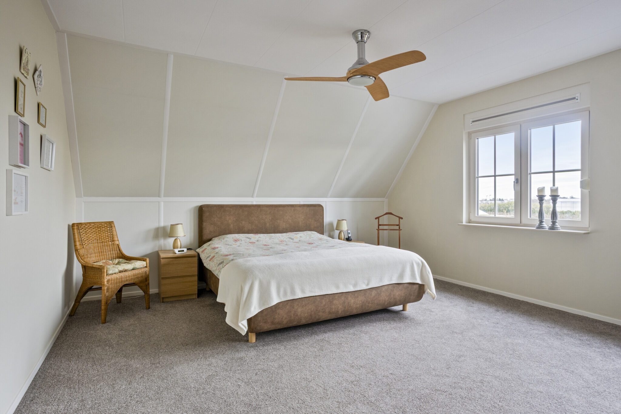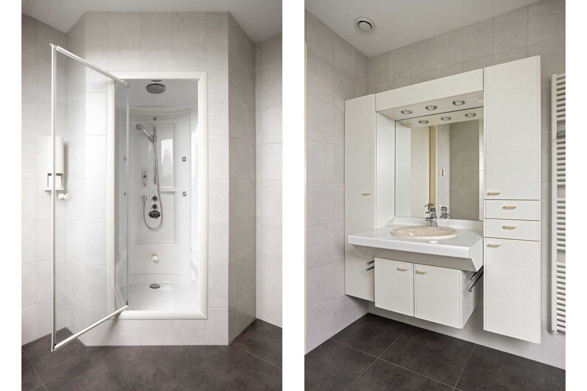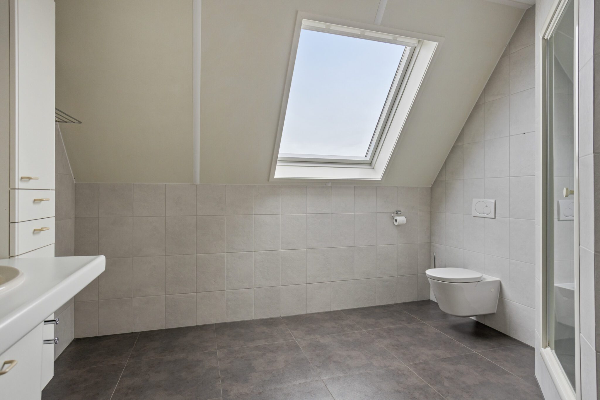 Via de vaste houten trap bereikt u de overloop met vide. Op de eerste verdieping zijn twee ruime slaapkamers, waarvan één voorzien van vaste wastafel. De slaapkamers zijn eenvoudig met een tussenwand op te splitsen in meerdere kamers. De badkamer is voorzien van een douche met stoomcabine, wastafelmeubel en hangend closet.