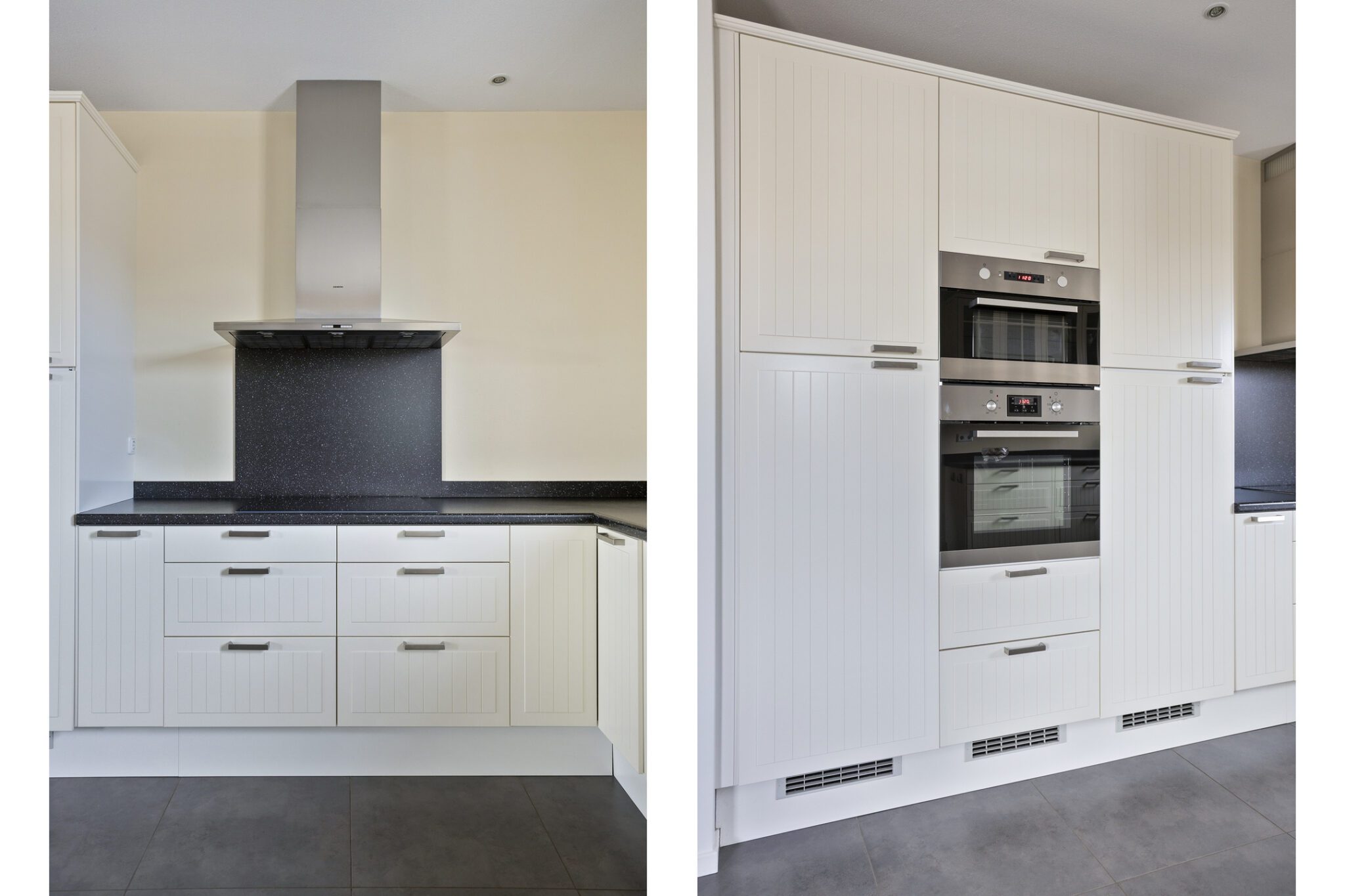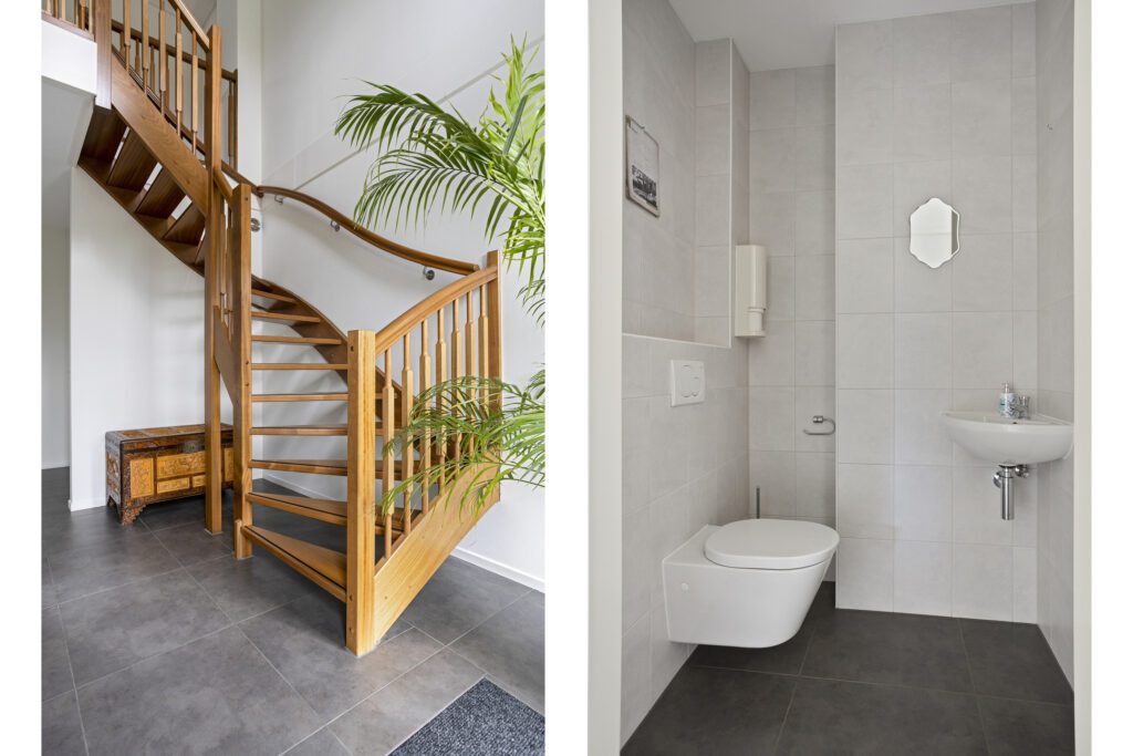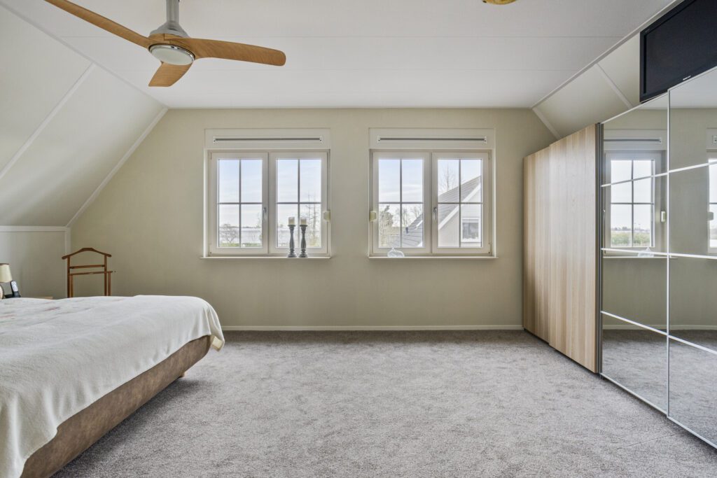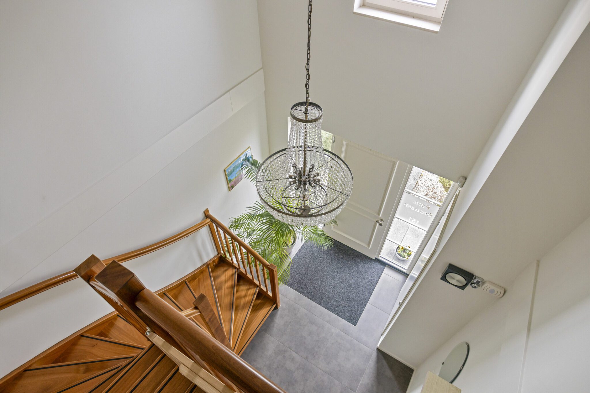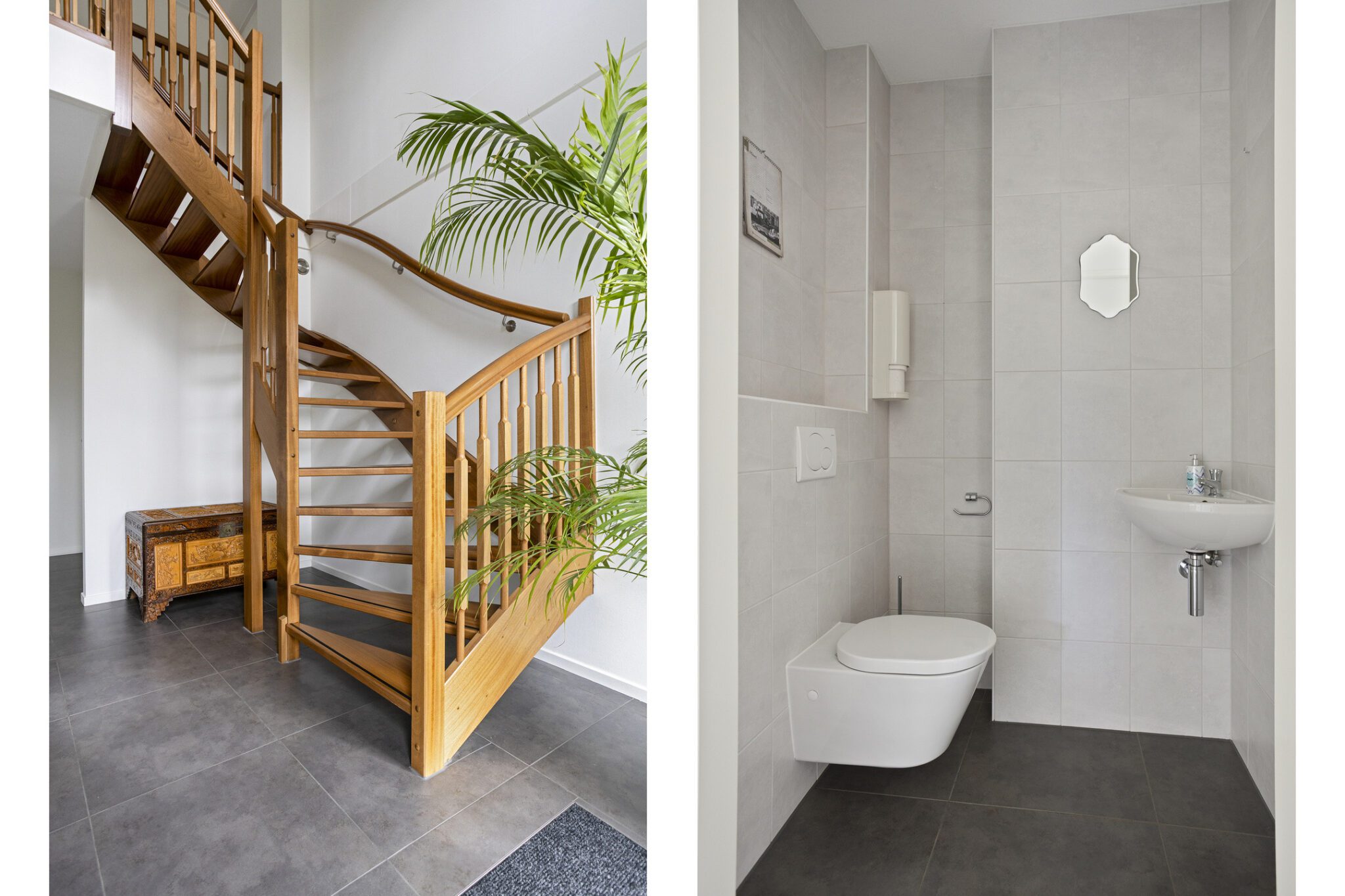 Via de vaste houten trap bereikt u de overloop met vide. Op de eerste verdieping zijn twee ruime slaapkamers, waarvan één voorzien van vaste wastafel. De slaapkamers zijn eenvoudig met een tussenwand op te splitsen in meerdere kamers. De badkamer is voorzien van een douche met stoomcabine, wastafelmeubel en hangend closet.