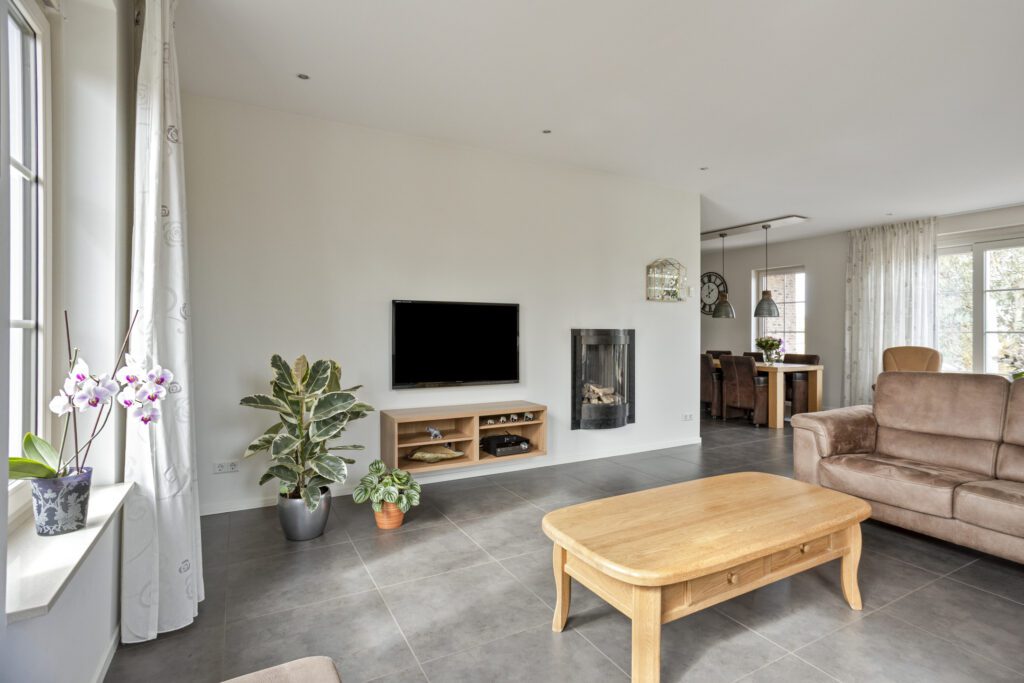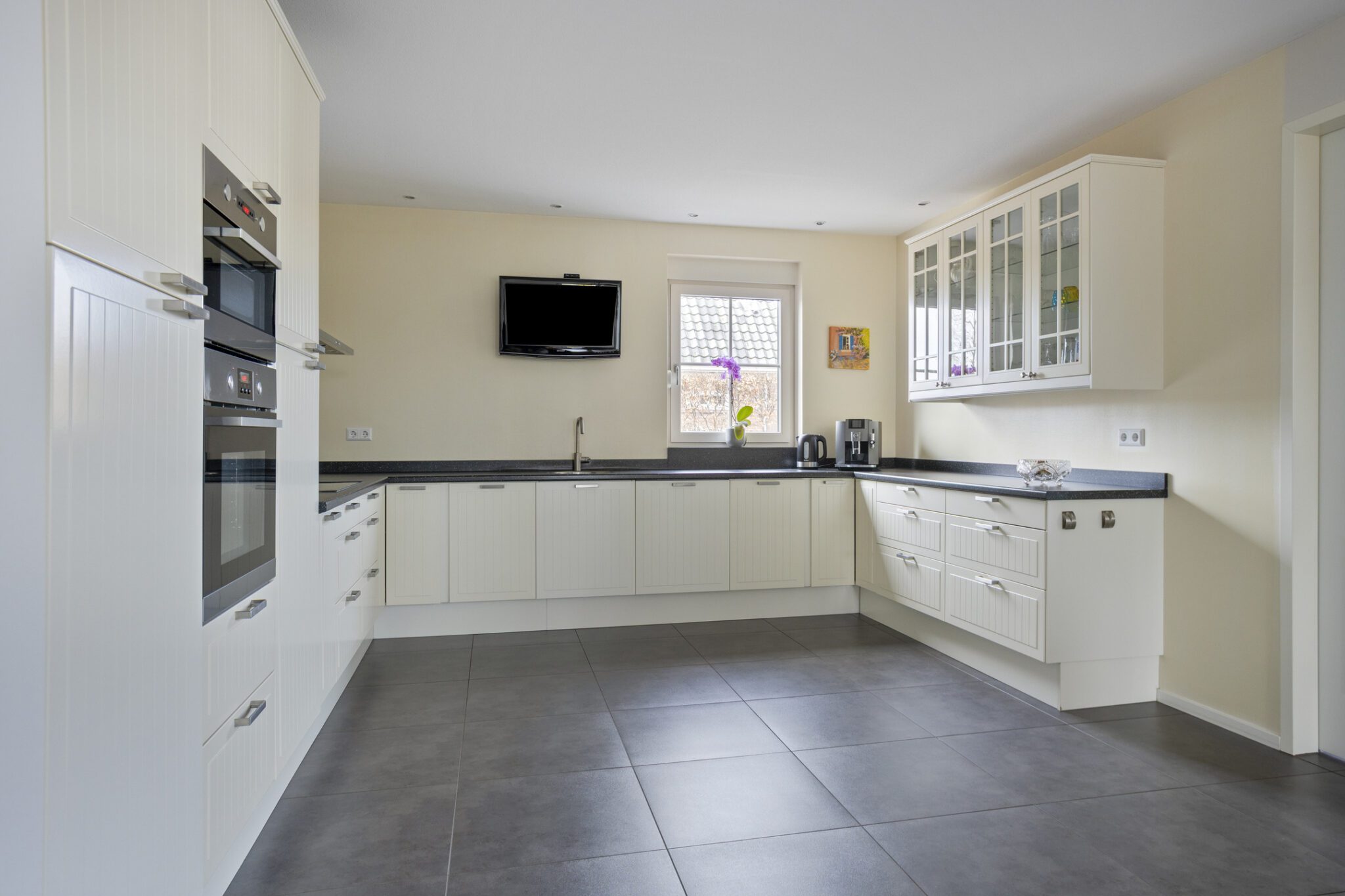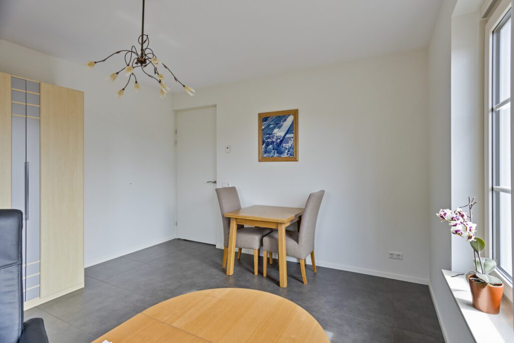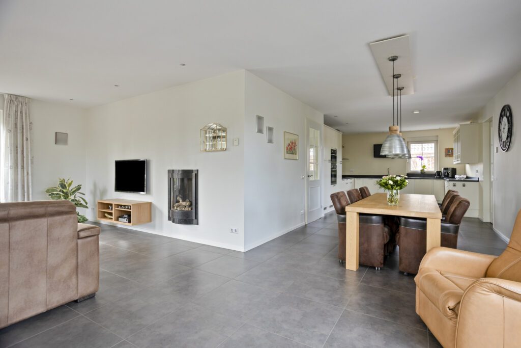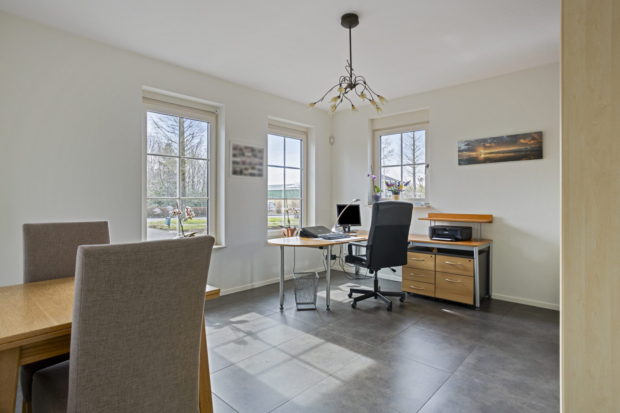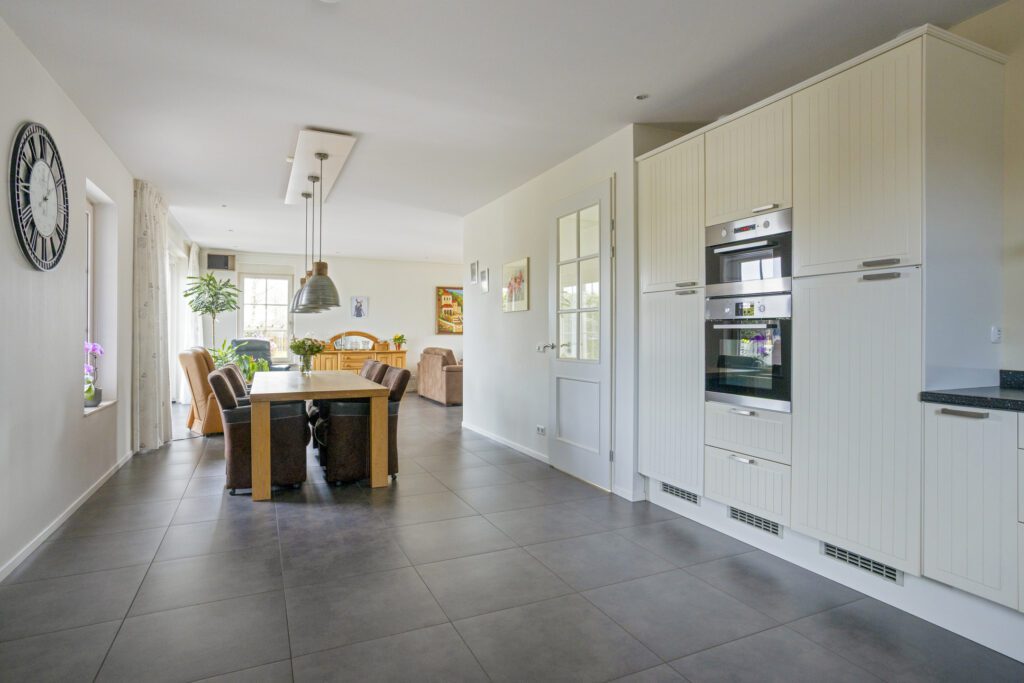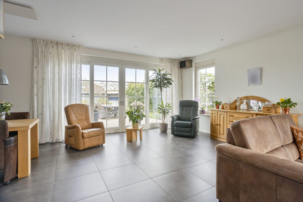 De woonkamer is voorzien van een gaskachel en is heerlijk licht door de raampartijen aan drie zijden van de kamer, met uitzicht op de tuin en de omgeving. De woonkamer, staat in open verbinding met de keuken en heeft schuifdeuren naar het onderheide terras aan de noordoostzijde. De keuken heeft een moderne uitstraling en is ingericht met diverse inbouwapparatuur. Naast de keuken bevindt zich de bijkeuken met wasgelegenheid, kastenwand en deur naar de achtertuin. De slaapkamer op de begane grond is ruim en thans in gebruik als kantoor.